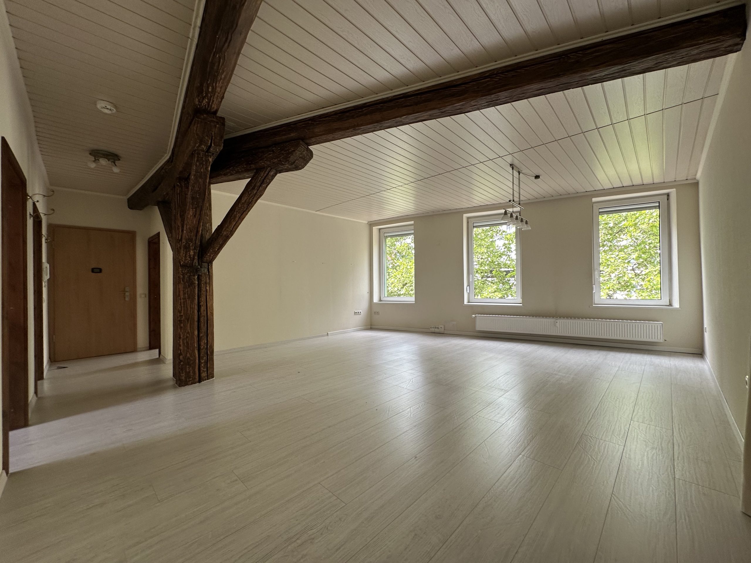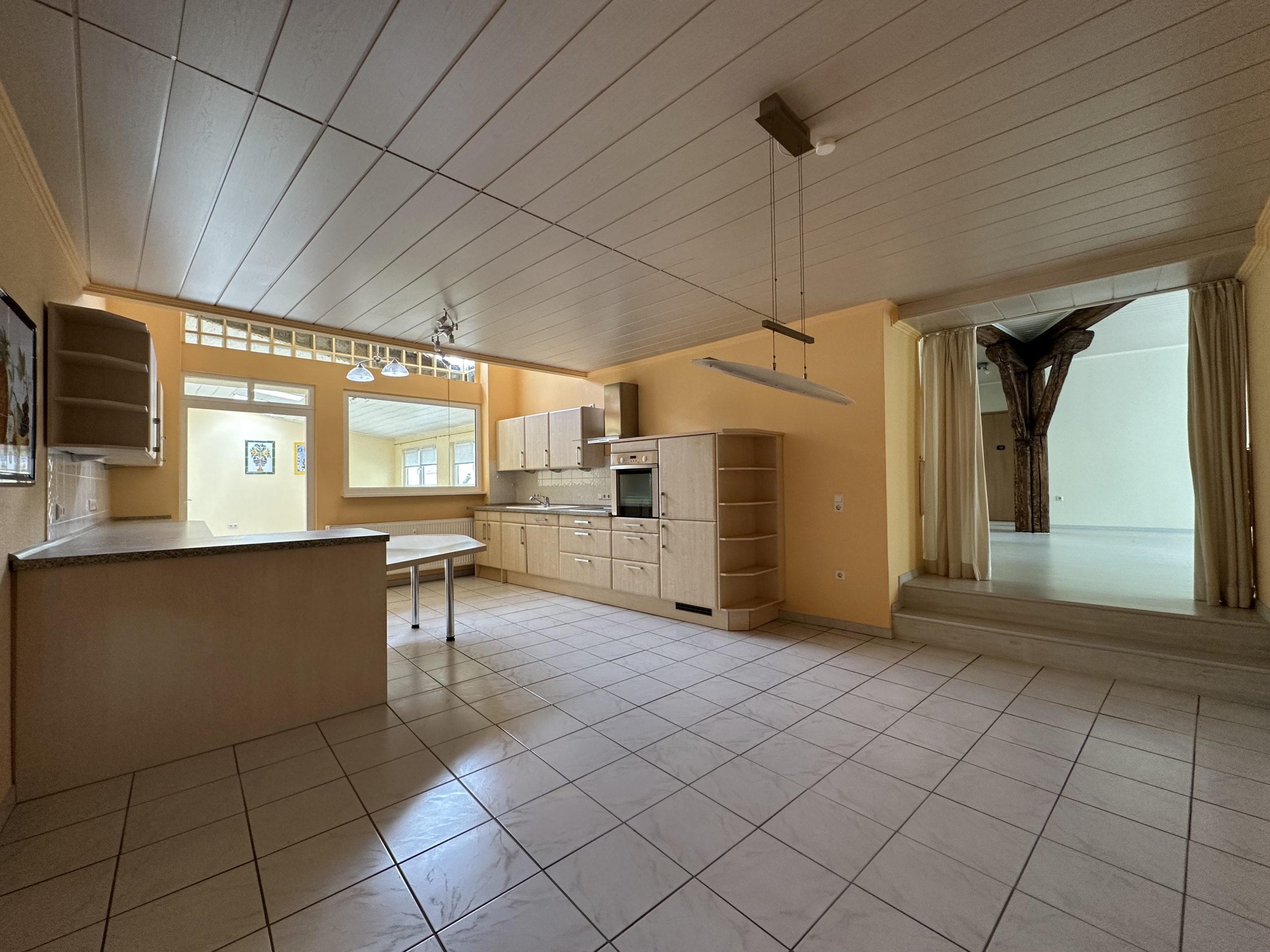 Diese charmante 4-Zimmerwohnung vereint stilvolle Wohnqualität mit dem besonderen Flair traditioneller Handwerkskunst. Das offenliegende Gebälk verleiht den Räumen eine warme, einladende Atmosphäre und schafft eine einzigartige Verbindung aus Historie und modernem Wohnkomfort. Die Wohnung befindet sich im 1. Obergeschoss eines gepflegten Wohn- und Geschäftshauses in bester Citylage – direkt im Herzen Bad Kreuznachs, unweit des Schlossparks und des Panoramaweges. Der attraktive Grundriss der Einheit bietet ein geräumiges Wohnzimmer, eine Küche mit Einbauküche, zwei großzügige Schlafzimmer, ein Hobbyraum mit angrenzendem Vorratsraum sowie ein Badezimmer mit Badewanne und hochwertigen Schränken. Die hochwertige Einbauküche von Nolte mit Markengeräten und integrierter Waschmaschine sowie die Vollausstattung mit Unter- und Spiegelschrank im Tageslicht- Bad sind im Mietzins enthalten. Überzeugen Sie sich selbst und kontaktieren Sie mich gerne bezüglich eines Besichtigungstermins. Ich freue mich auf Ihre Anfrage!